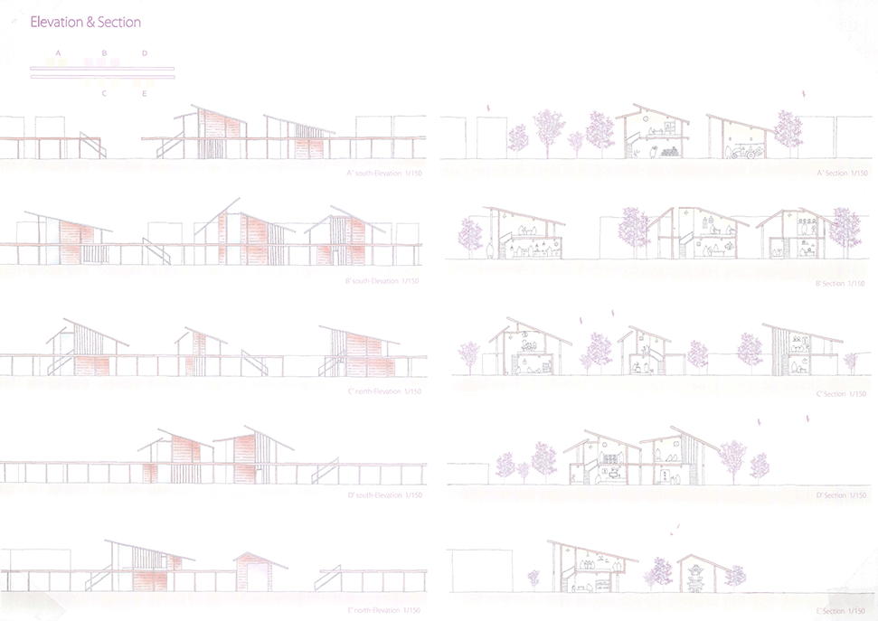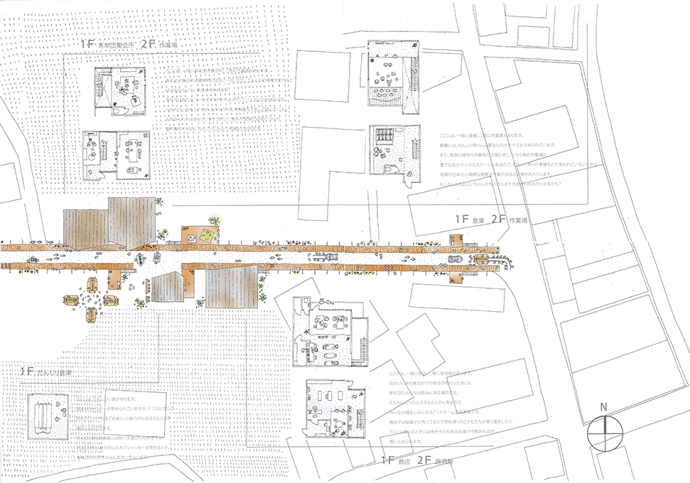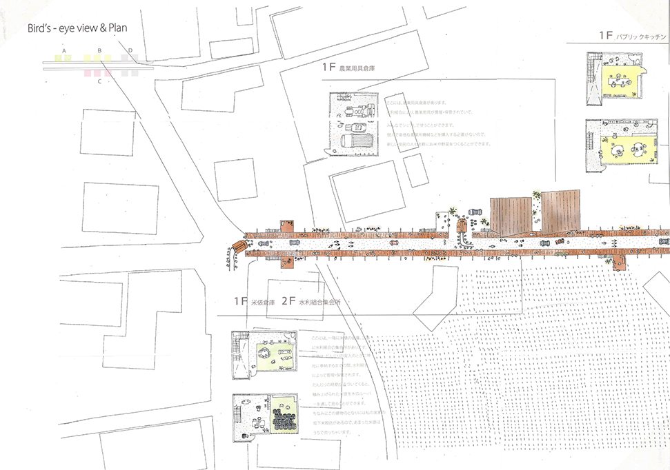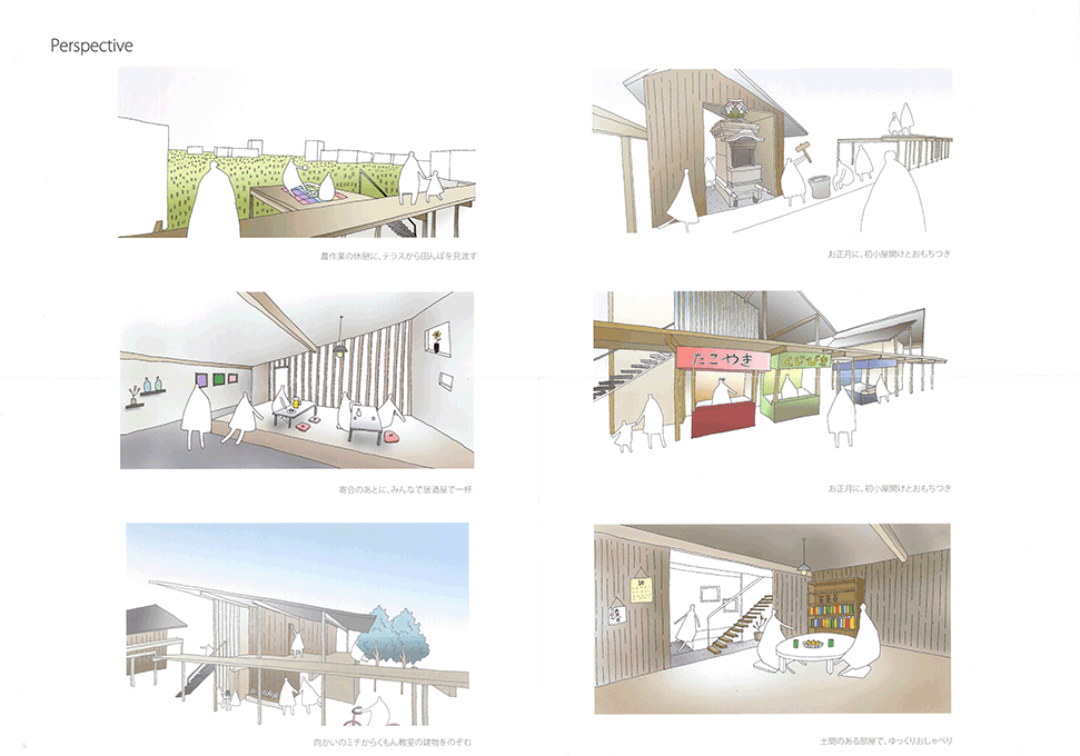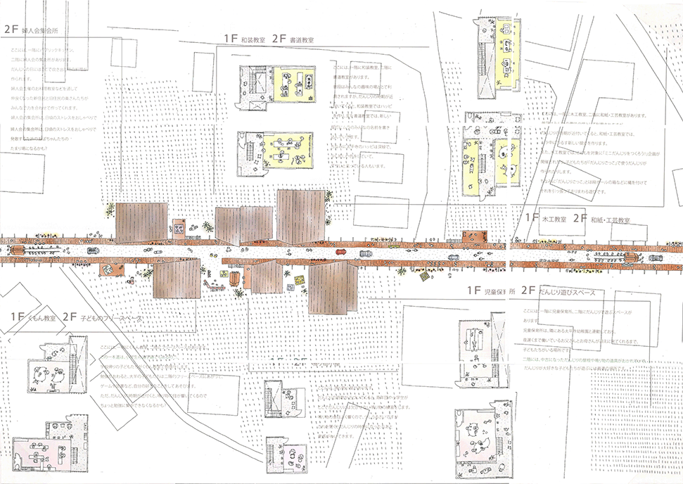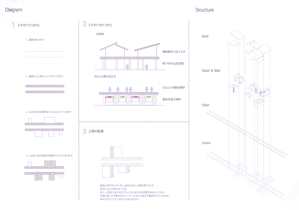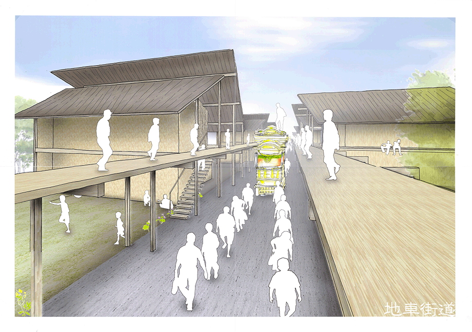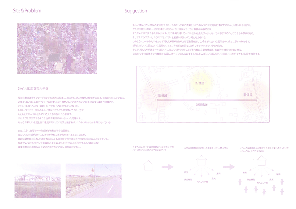 近年、断片的に休耕田が住宅地として開発され、その住宅地に住み始めた新しい住民と、農地の東西のムラに住む住民の交流がほとんどない堺市西区太平寺地区において、太平寺地区を含む地域で行われていた練物(屋台行列)が起源とされるだんじり祭りに関わる建築群を計画することで、新住民と旧住民の交流を創出しようとする提案である。太平寺地区の現状や、だんじり祭りに関わる1年間のスケジュールなどを十分に調査したうえで計画提案されており、社会的意義や計画意図が明確である点は高く評価される。一方で、具体的な建築設計については課題が残る。例えば、だんじり祭りの際に山車が通る東西の直線道路沿いに高さ3mのデッキが長さ400mに渡って計画されているが、既存の建物との関係や、「農」の風景との関係、山車とデッキ上の人の視線の関係など、さらなる検討が必要である。このように建築物の設計では課題が残るが、地域の現状を十分に調査したうえで、明確な計画意図をもったストーリーは評価に値する。