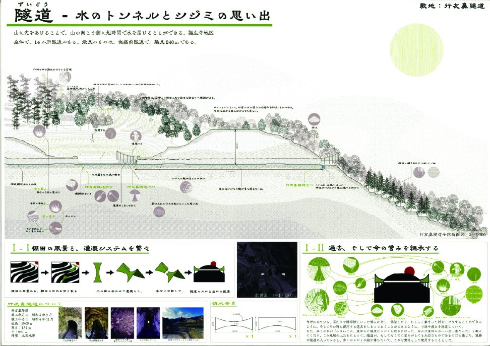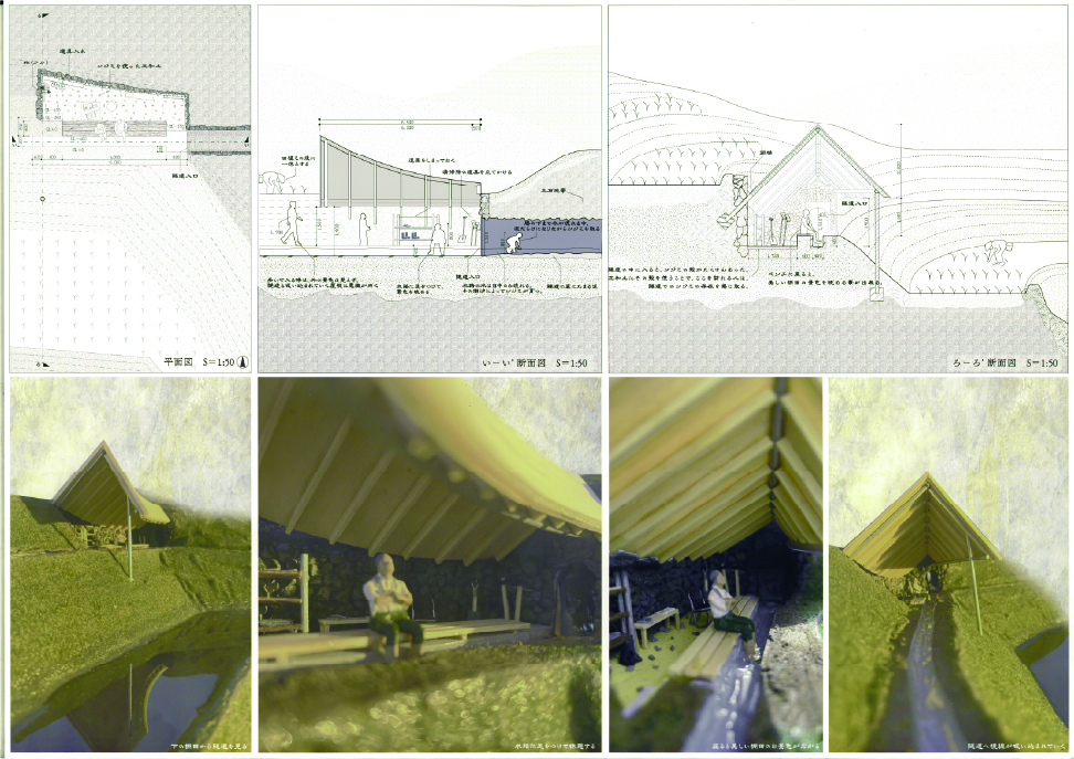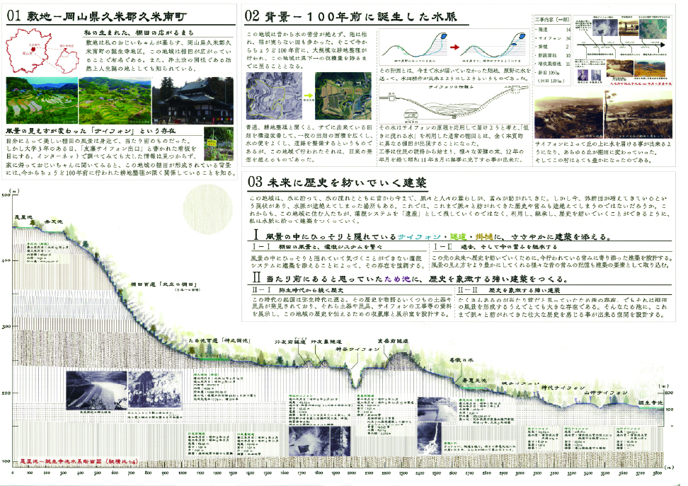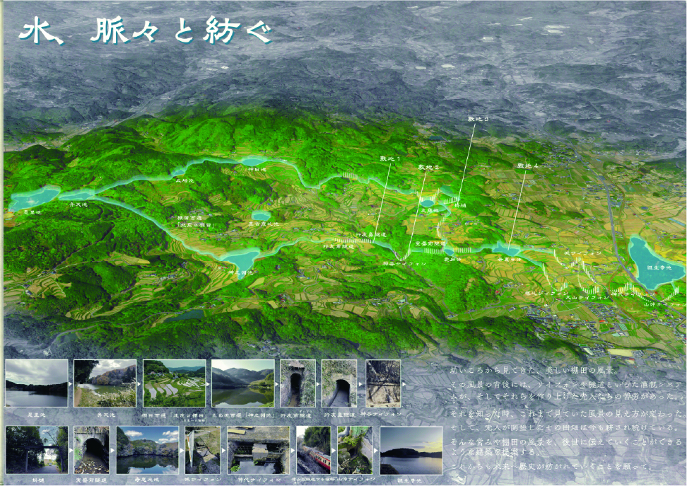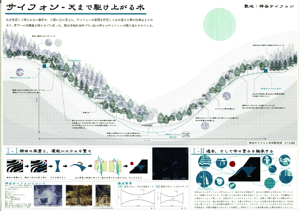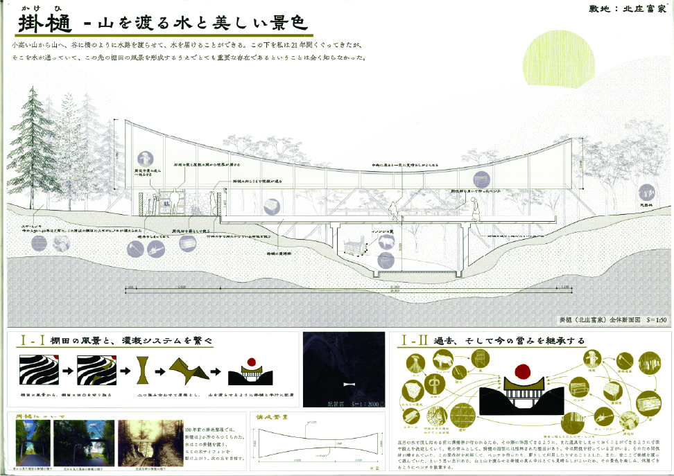 100年ほど前に瀬戸内式気候で水不足に解消する目的で灌漑システムをつくり,棚田と池・用水による美しい風景を作り上げた.時が流れて人口が減少した現在も使われている灌漑システムを後世にも伝えていくために,目に見えているようで見えていない用水にささやかであるが小さな建築を設計した.それは新しい風景をつくるとともに灌漑システムを維持管理する生活者に寄り添う形で用水を守る役割を果たしている点を評価する.それであるからこそ,地域の風土に根ざしたアプローチも必要であるが,単純な形態の操作だけで建築を作り上げている点が惜しまれる.また未来へ歴史を紡ぐのであれば灌漑システム全体を捉える視点も持つべきであっただろう.