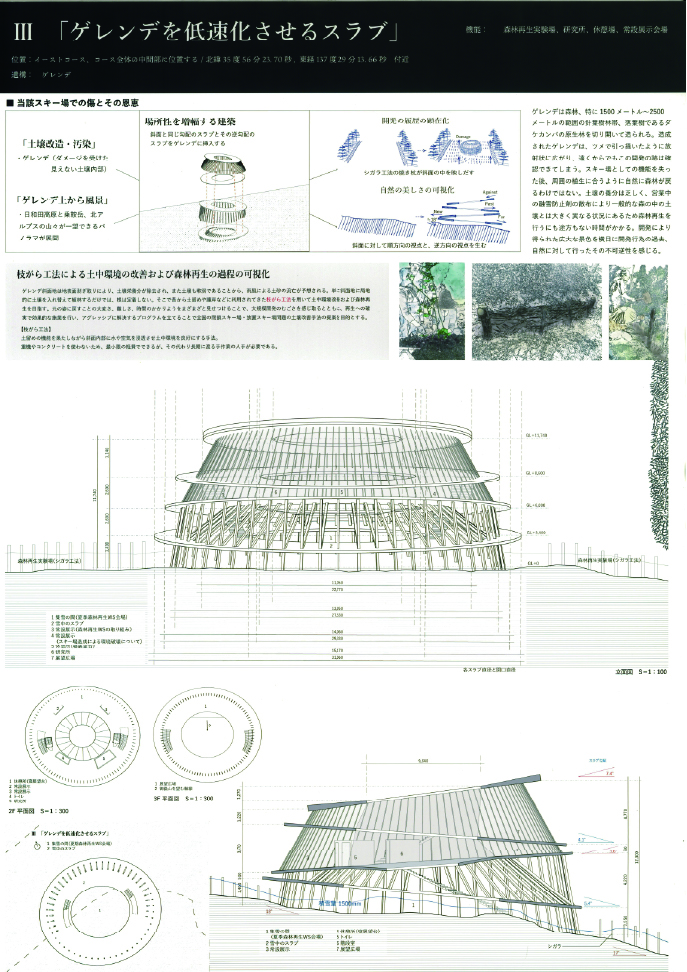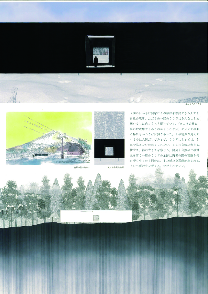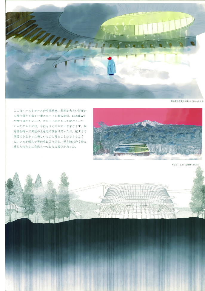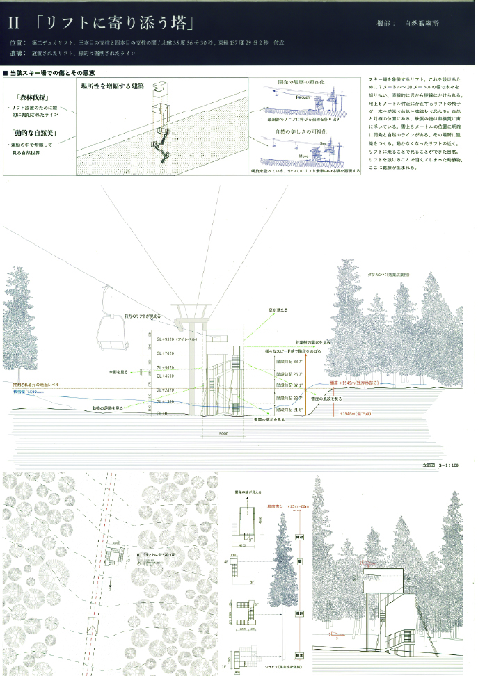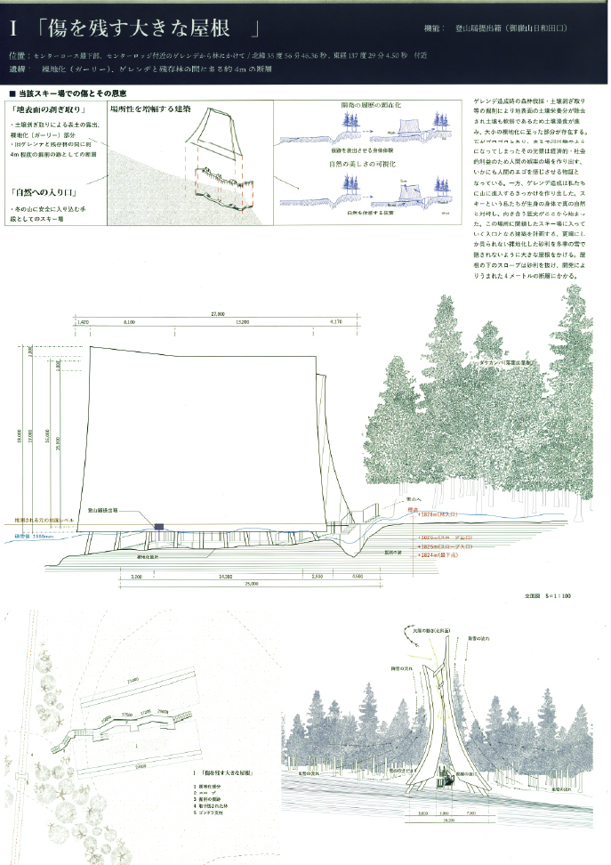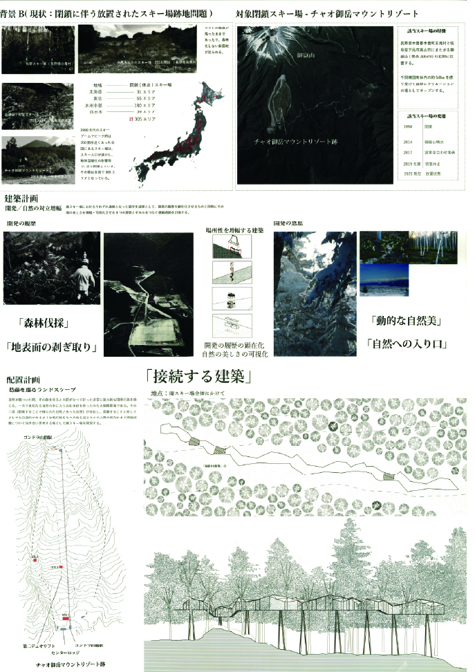 御岳のスキー場跡地に開発の履歴と開発によって得られた恩恵を訪れた人が考える人と自然の関係を問いかける作品である.ありのままの自然と開発の跡が顕著に現れるスキー場跡地4箇所に固有の履歴と恩恵を体験できる建築空間を設計している.敷地を丁寧に読み取り,慎重な形態操作を行うことで美しい建築を作り上げ,それによって中立的な視点から人と自然の関係の問いかけが実現できている.またそこで体験できる空間を図面に表現する点も優れている.しかしながらそれぞれの建築の関係が読み取れない点,ひいてはスキー場跡地全体で得られる体験がどのようなものであるのかがわからない点が惜しまれる.