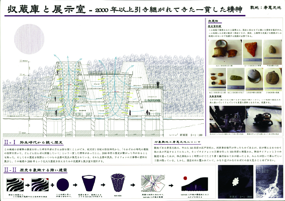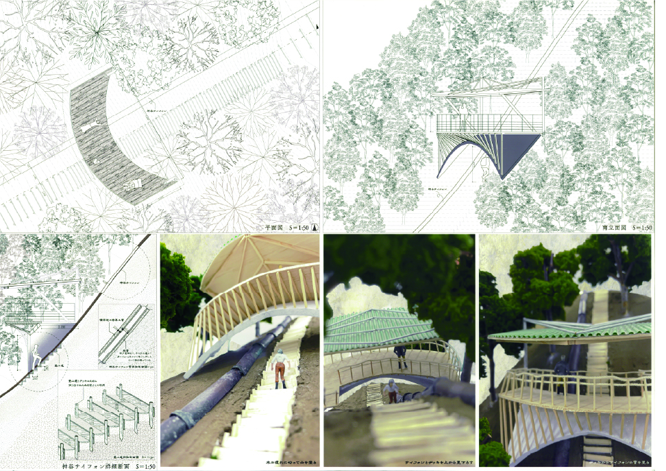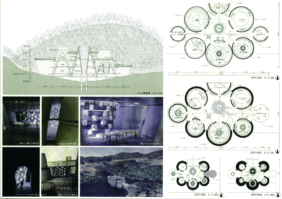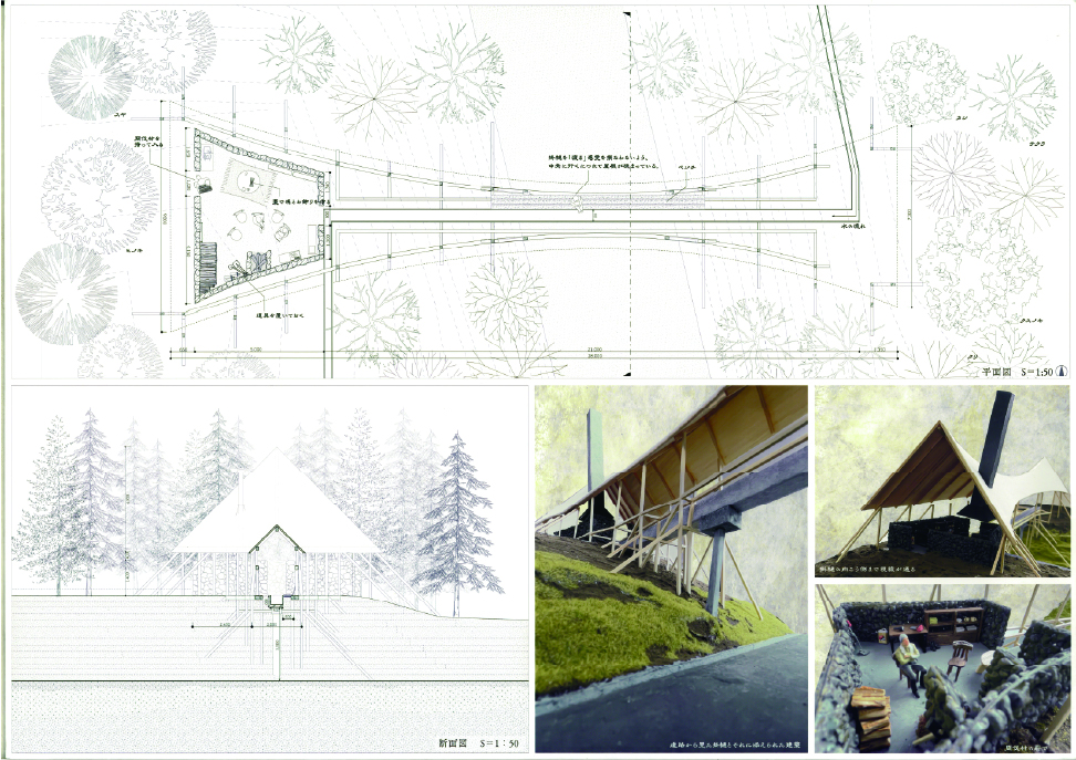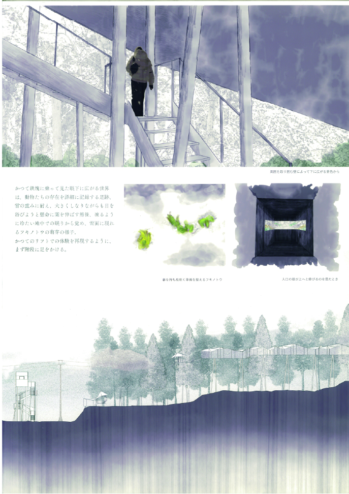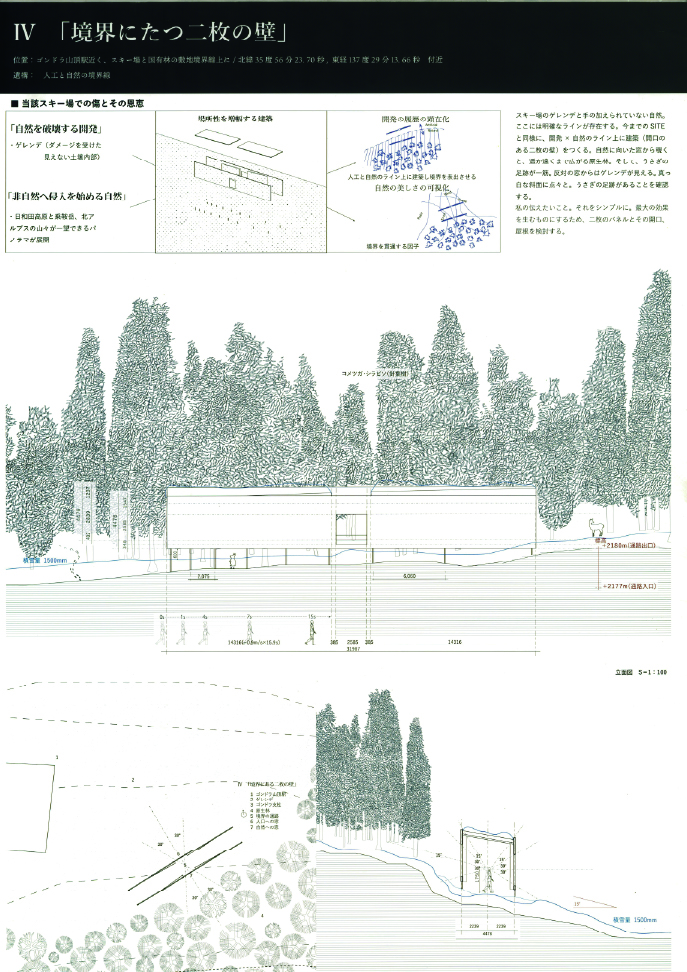 御岳のスキー場跡地に開発の履歴と開発によって得られた恩恵を訪れた人が考える人と自然の関係を問いかける作品である.ありのままの自然と開発の跡が顕著に現れるスキー場跡地4箇所に固有の履歴と恩恵を体験できる建築空間を設計している.敷地を丁寧に読み取り,慎重な形態操作を行うことで美しい建築を作り上げ,それによって中立的な視点から人と自然の関係の問いかけが実現できている.またそこで体験できる空間を図面に表現する点も優れている.しかしながらそれぞれの建築の関係が読み取れない点,ひいてはスキー場跡地全体で得られる体験がどのようなものであるのかがわからない点が惜しまれる.