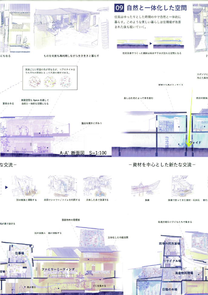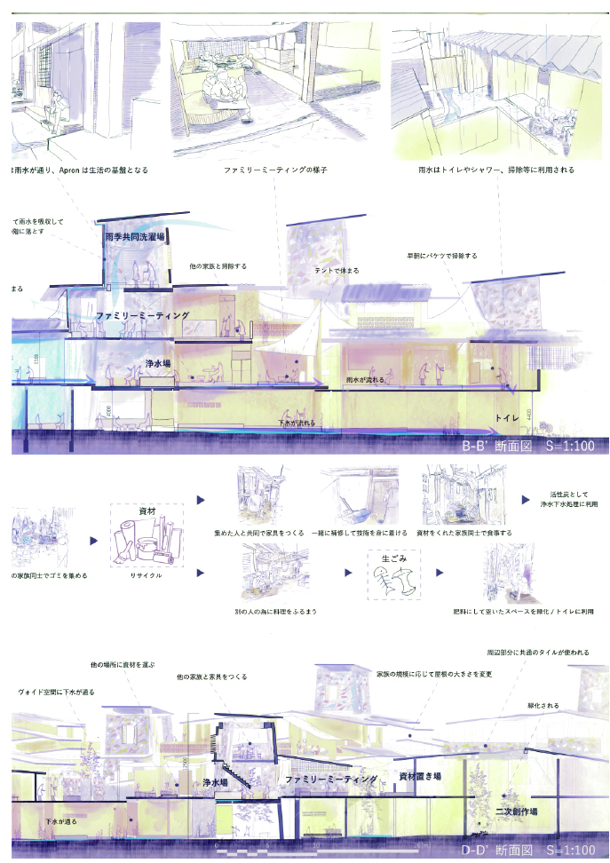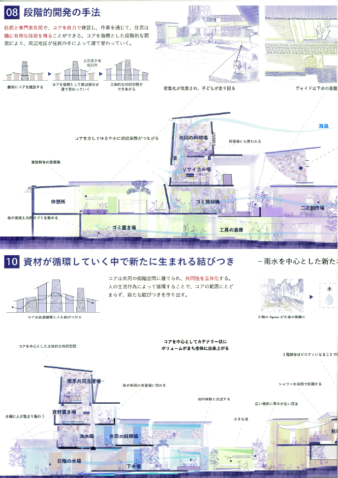作者は、現地調査より、既存の地域住民の生活を美しいと捉え、住民の行動や振る舞いが生まれる社会・空間構造を読み取り、それらを継承する再編計画を試みている。そこには、既存の住環境問題を改善するためのインフラ施設を軸としながらも、地域住民の行動や振る舞いを継承するための様々な空間がヒューマンスケールから提案されている。さらに、地域の材料や工法を用いて、地域住民が住環境を段階的に増築していくプロセスを提案し、地域の文脈が途切れず継承していく再編のあり方を追究している。作者は、既存の地域に宿っている住民の生活や記憶を継承するための仕組みを丁寧に提案する。しかしその一方で、継承の仕組みは、既存の空間構成を引用することに留まっており、地域住民の生活がなぜ美しいか、その本質を作者の視点で翻訳する過程が欠けている。地域に新たな変化をもたらしながら地域文脈を継承するための作者独自の提案について更なる検討が必要である。