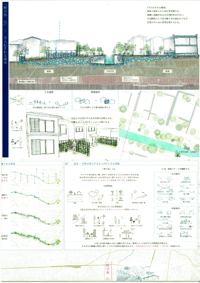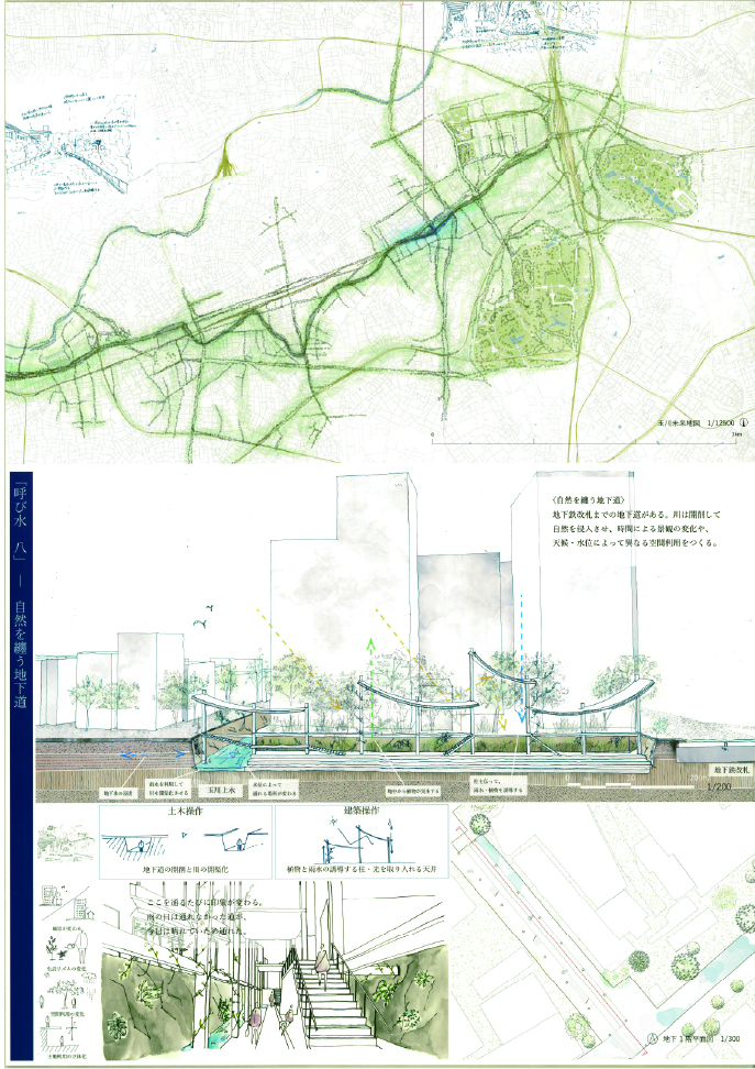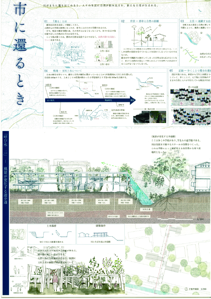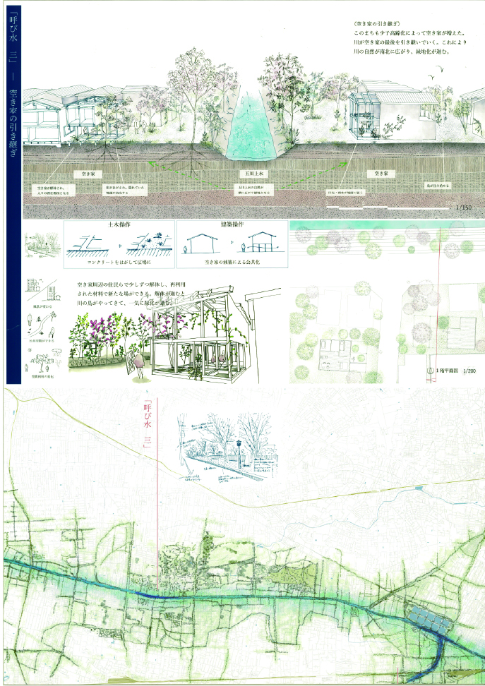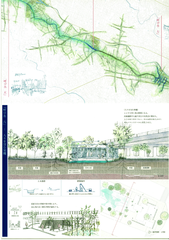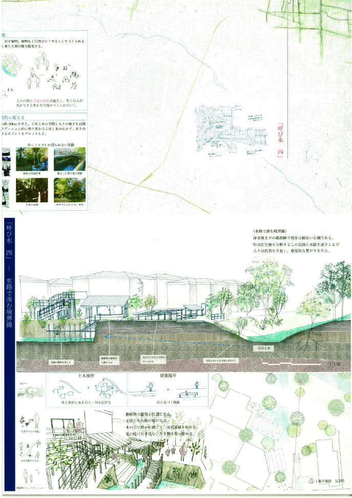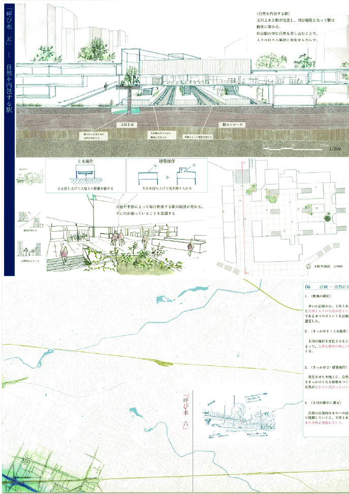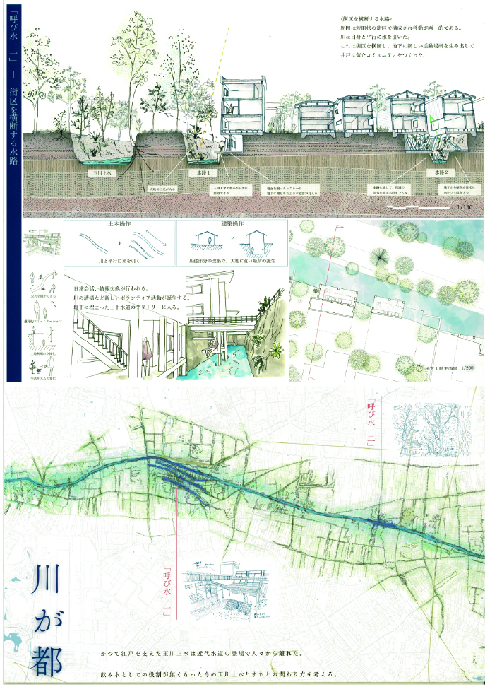 玉川上水はかつて、江戸の人口増加に伴う飲料水確保のために多摩川から水を引いた重要な水インフラであった。現在の玉川上水は、人為的管理から離れた部分で、自然環境が再生している。作者は逆説的に、人間の管理から外れた空間に自然の再生力が働いている事実に着目し、「自然が都市を侵食していく」ことで、自然と都市の新たな共生関係を模索している。「自然を侵食させる建築(呼び水)」を玉川上水の約30kmという線形の水空間に対して戦略的に配置するという構想は、自然の力を都市計画に積極的に取り込む革新的な提案として秀逸である。また、都市開発における人間中心主義を再考し、人間を含む生態系全体を視野に入れた都市計画の必要性を示唆している点は、現代の環境問題や持続可能性の課題に対する重要な問いかけとなっている。一方で、作者が設定した呼び水が時代とともに、どのように都市に滲み出(侵食)し、豊かな生態系の広がりを作りだすかについての説明が不足していた点はさらなる研鑽を期待したい。