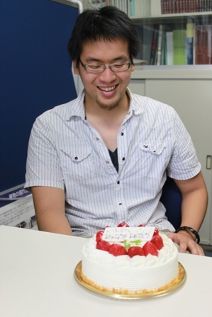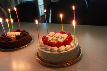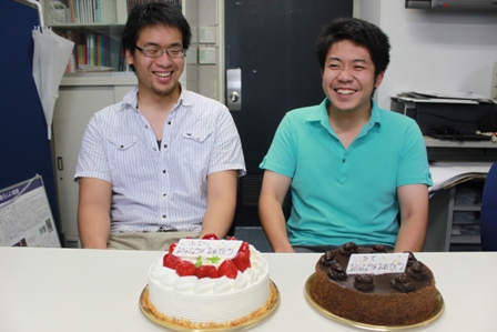 "6日,全体ゼミの後に藤井くんと秀川くんの誕生日を お祝いしました。 (ちなみに今日のゼミは,4回生の三木さんの研究報告でした!) ひでの誕生日を研究室でお祝いするのも,もう3回目なんやねー。 早いもんだ。 そしてこれで最後だと思うと少しさびしいですね。 あ,ふじいくん。お祝いするの遅くなってごめん[:汗:] いやー。しかしケーキ,おいしいよねv M2きし[:りんご:]"