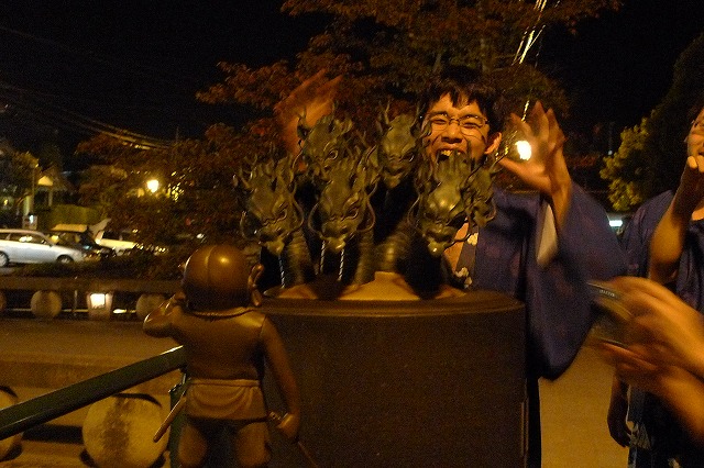 夜の散歩で見つけた、川沿いのスサノオ様が八岐大蛇を退治している銅像は面白かったです。