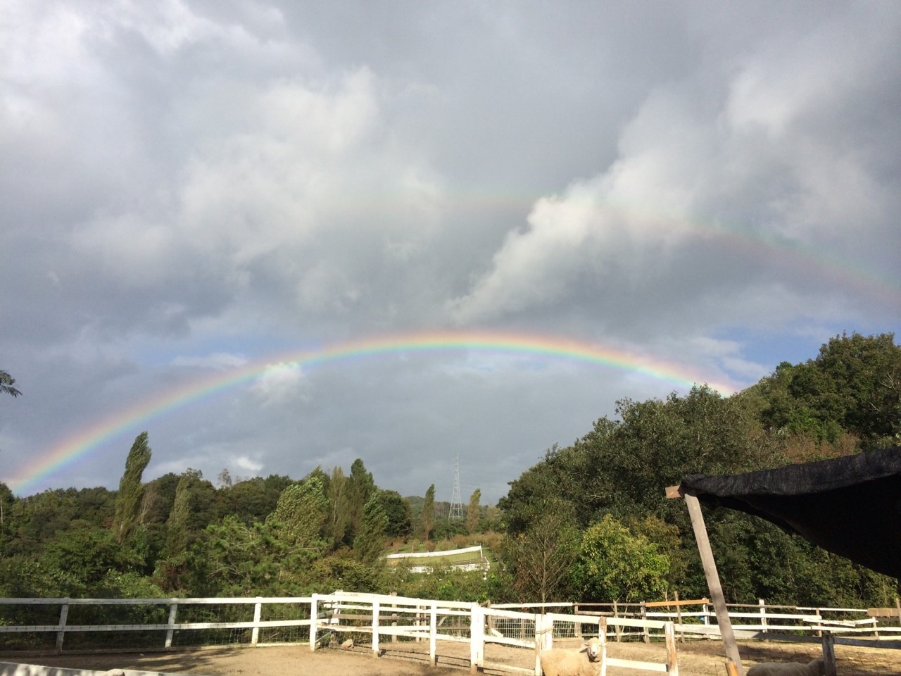 ソリで丘をすべって遊んでいると、とつぜん二重の虹があらわれてビックリしました。