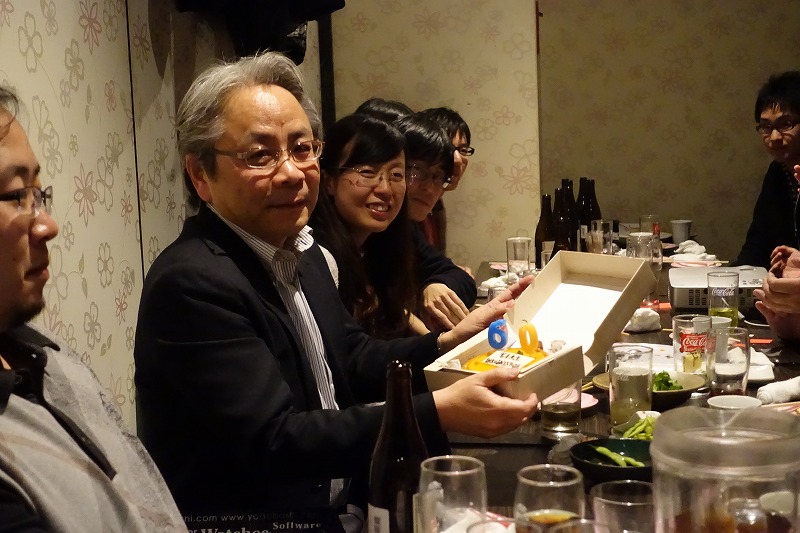 "宮本先生は今年で還暦を迎えられました。 そこで、追いコンの席を借りてささやかながらお祝いしました。 ついでのようになってしまい申し訳ありません… う〜む…とても60歳には見えませんね〜 今後ともご教授よろしくお願いします! B4 田中でした(-c・*)// "