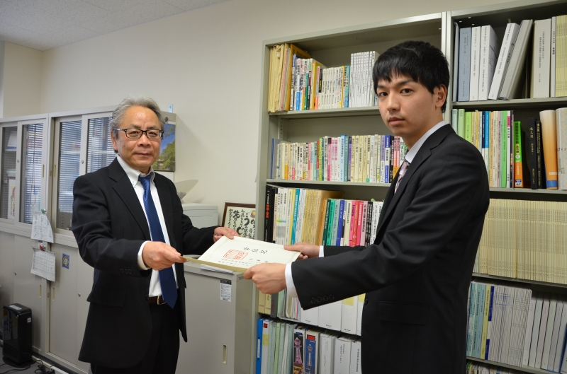 B4生(池田くん、北さん、久保くん、引山くん、松澤くん)の証書授与の様子です。
